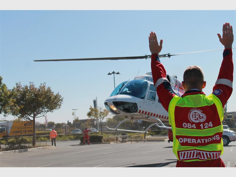 WOODMEAD – ER24 held a spectacular rescue demonstration which included a helicopter and a mangled car in the parking lot of the Woodmead Retail Park.