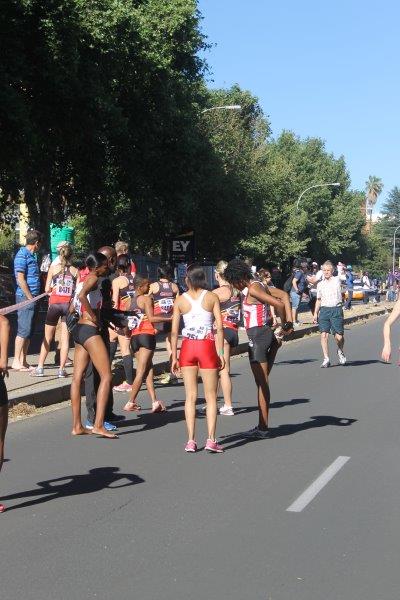 Leruo Khabutlane supports Lerato Mosele at the Spar Women’s Race at the Wanderers Club in Illovo.