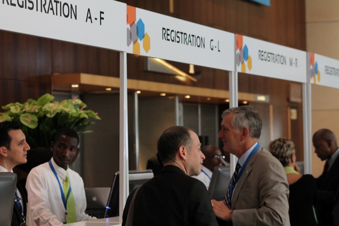Attendees register on day one of the C40 Summit at the Sandton Convention .