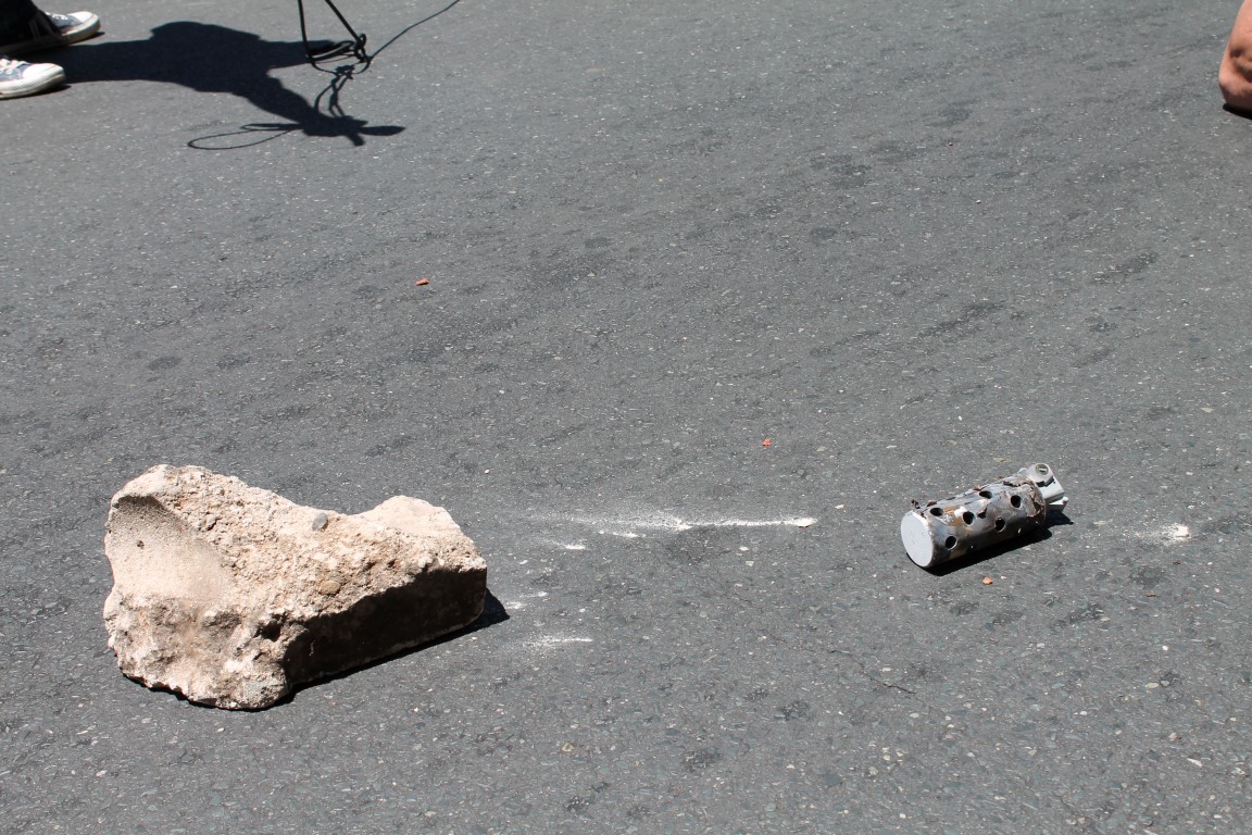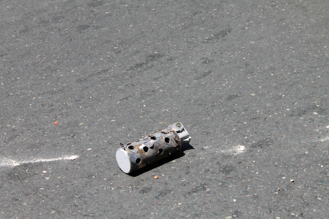 A rock thrown by protesters lays next to the police’s stun grenade.