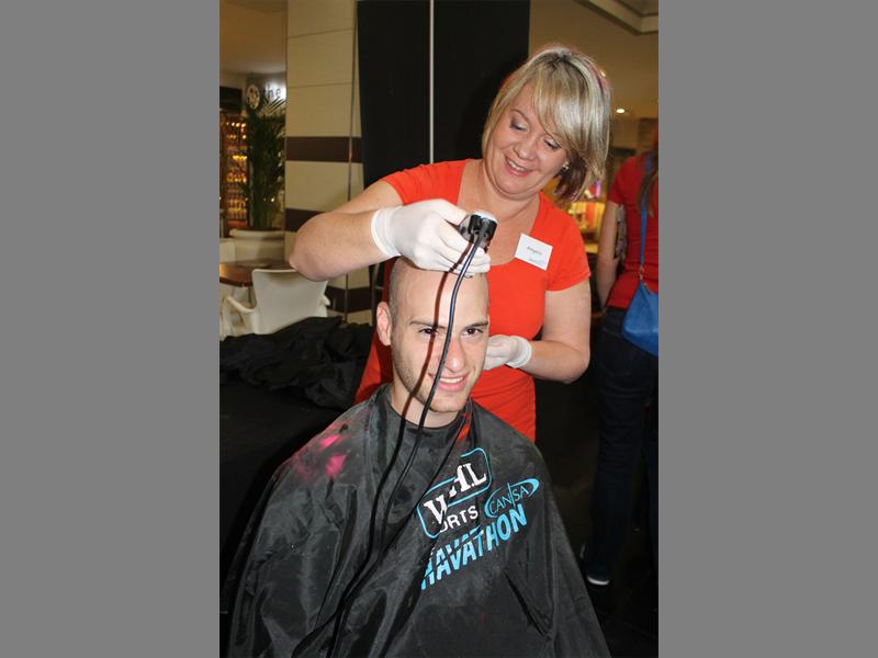 Shave it off… Angela Carle gives Brandon Pieprz a shave at the Cansa shaveathon at Benmore Gardens shopping centre.