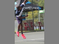 Lift off… St Stithans College tennis player Laurence Akwei competes in Saints festival tennis tournament.
