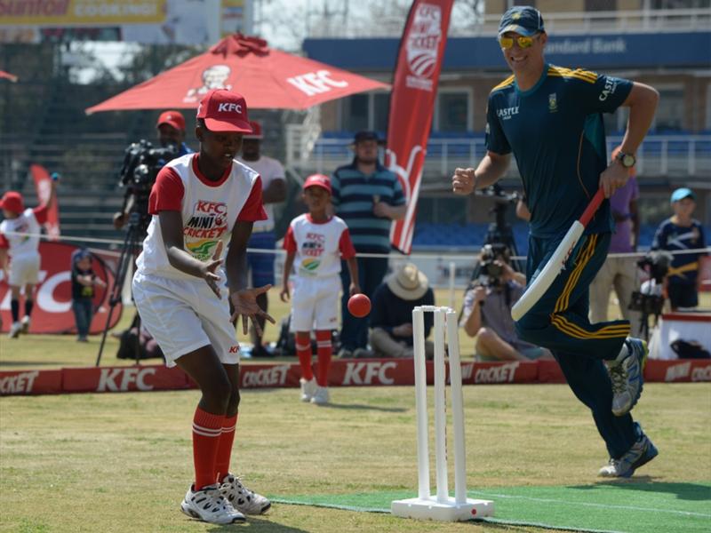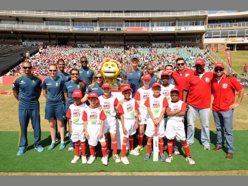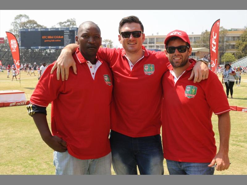 SA legends… Proteas men and women’s cricket team with the mini-cricket kids at the KFC Mini-cricket tour launch.