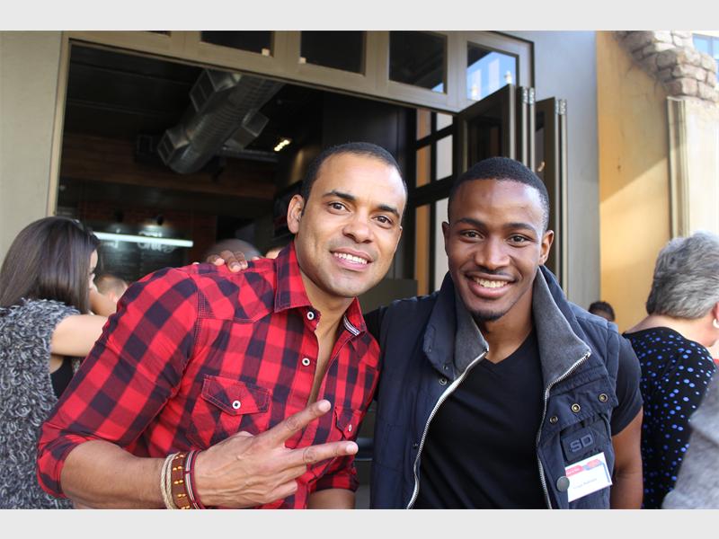 Good times… Actor Theodore Jantjies enjoys the launch with model, Lunga Tshabalala at Montecasino.