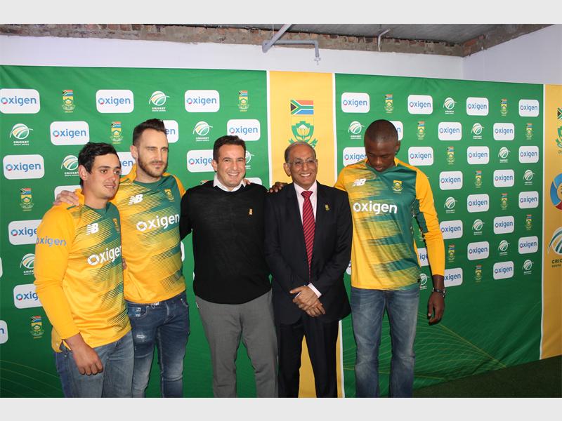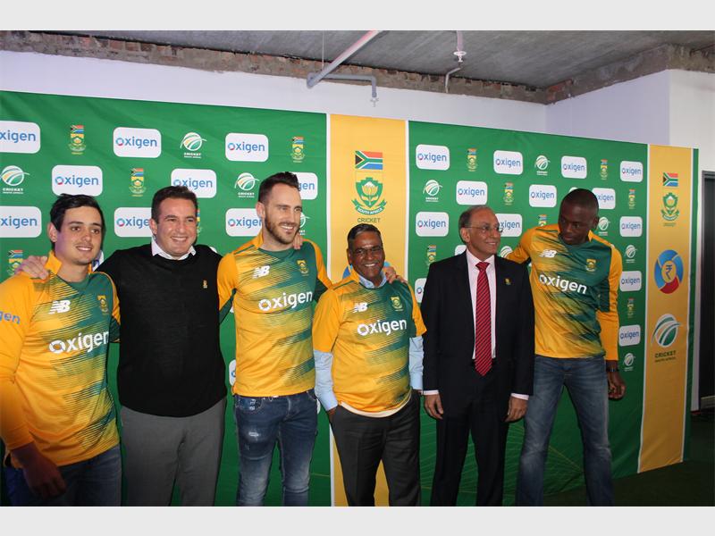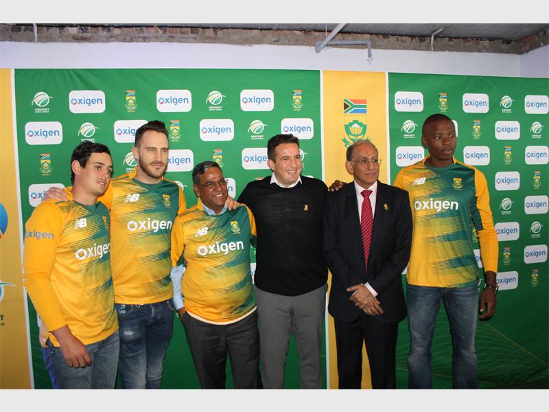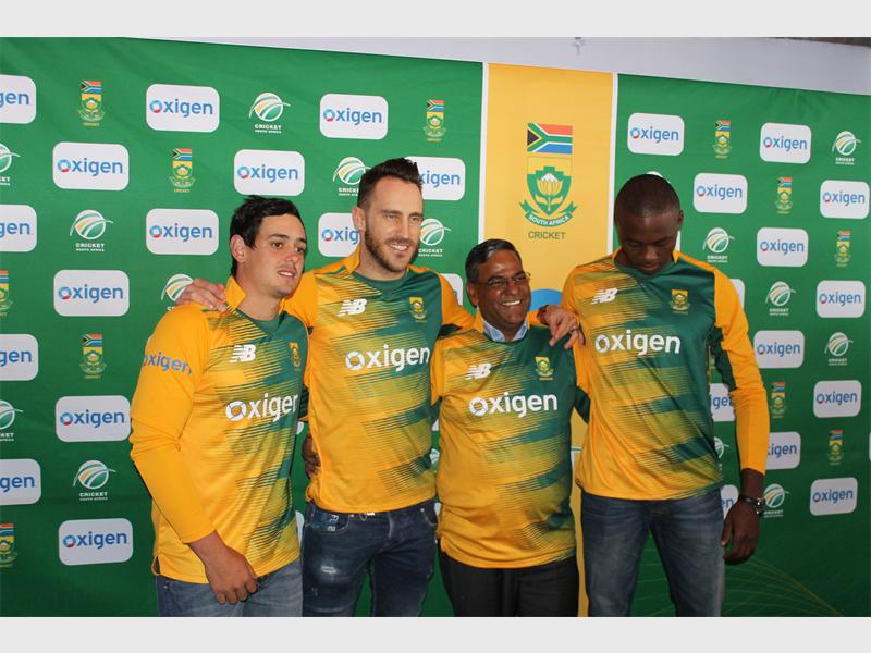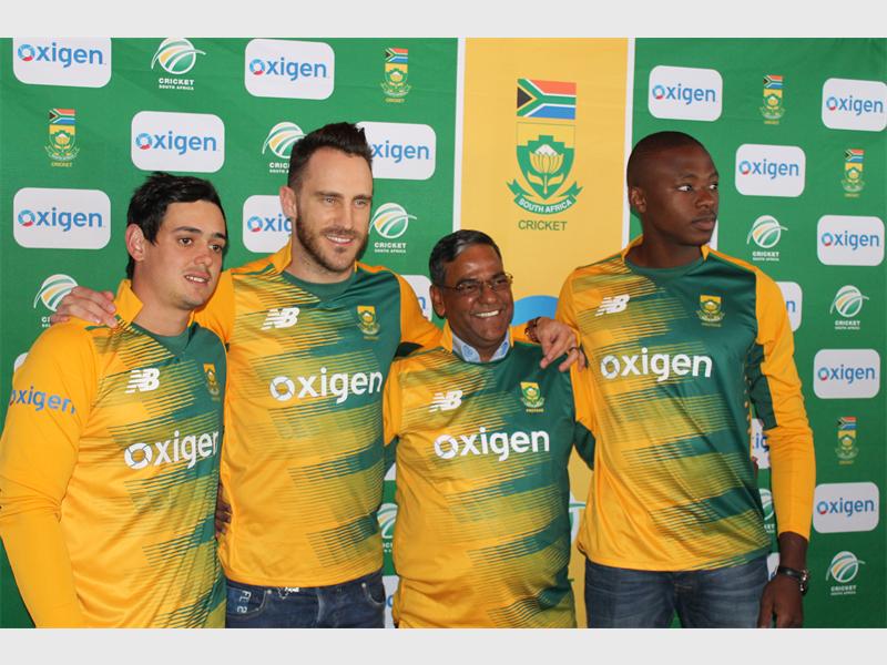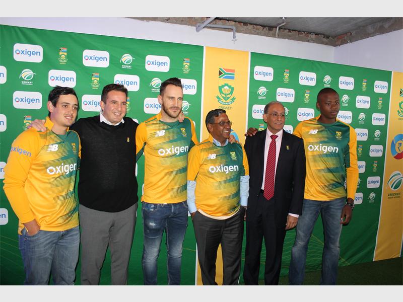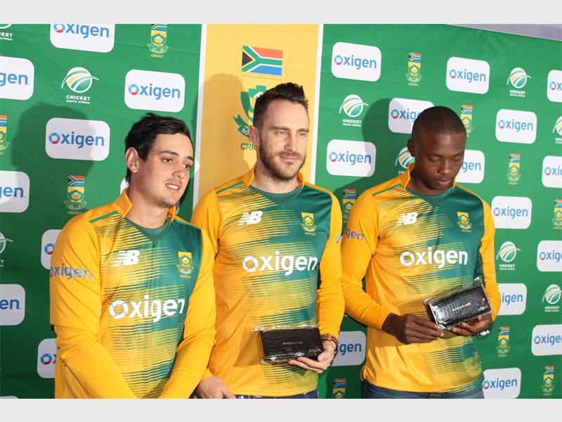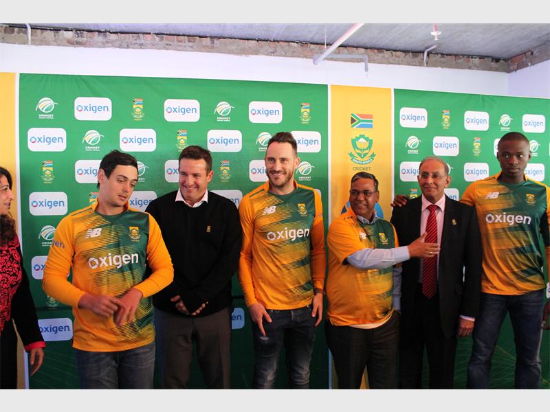South African Cricket team players in their new kit with the sponsors from Oxigen and Blue Label Telecoms.