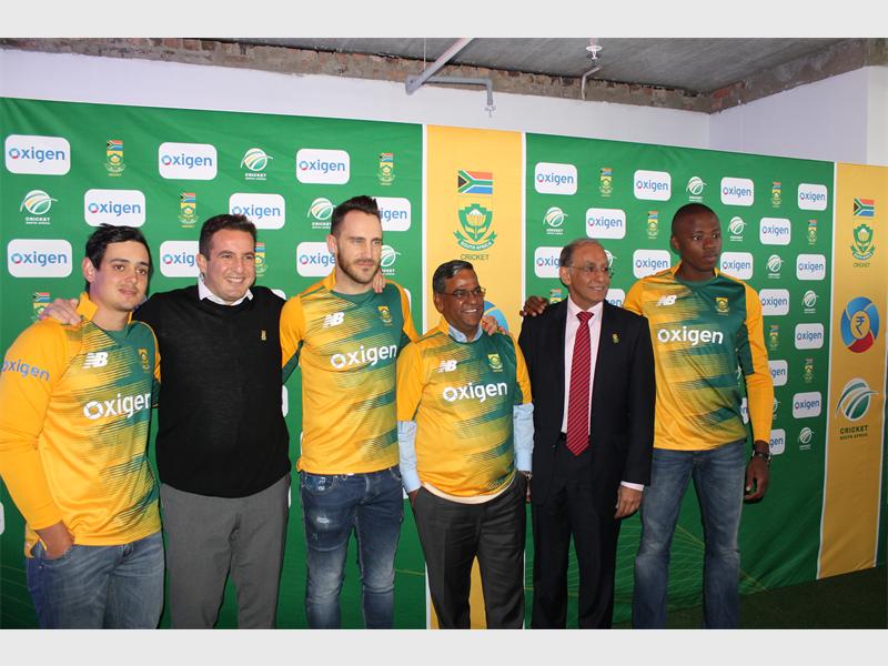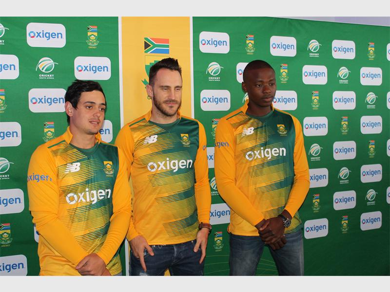 South African Cricket team players wear their new kit with the sponsors from Oxigen and Blue Label Telecoms.