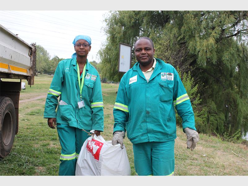 City Parks staff, Esther Muka and Joseph Hlongwane do their part to clean Braamfontein Spruit.