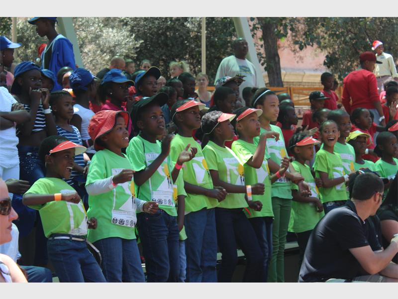COLOURFUL: Montecasino Bird Gardens mascots with the children.