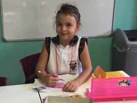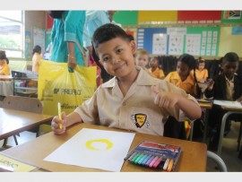 BIG SMILE: Pupil, Gemma Helmand, colours in on her first day of school.