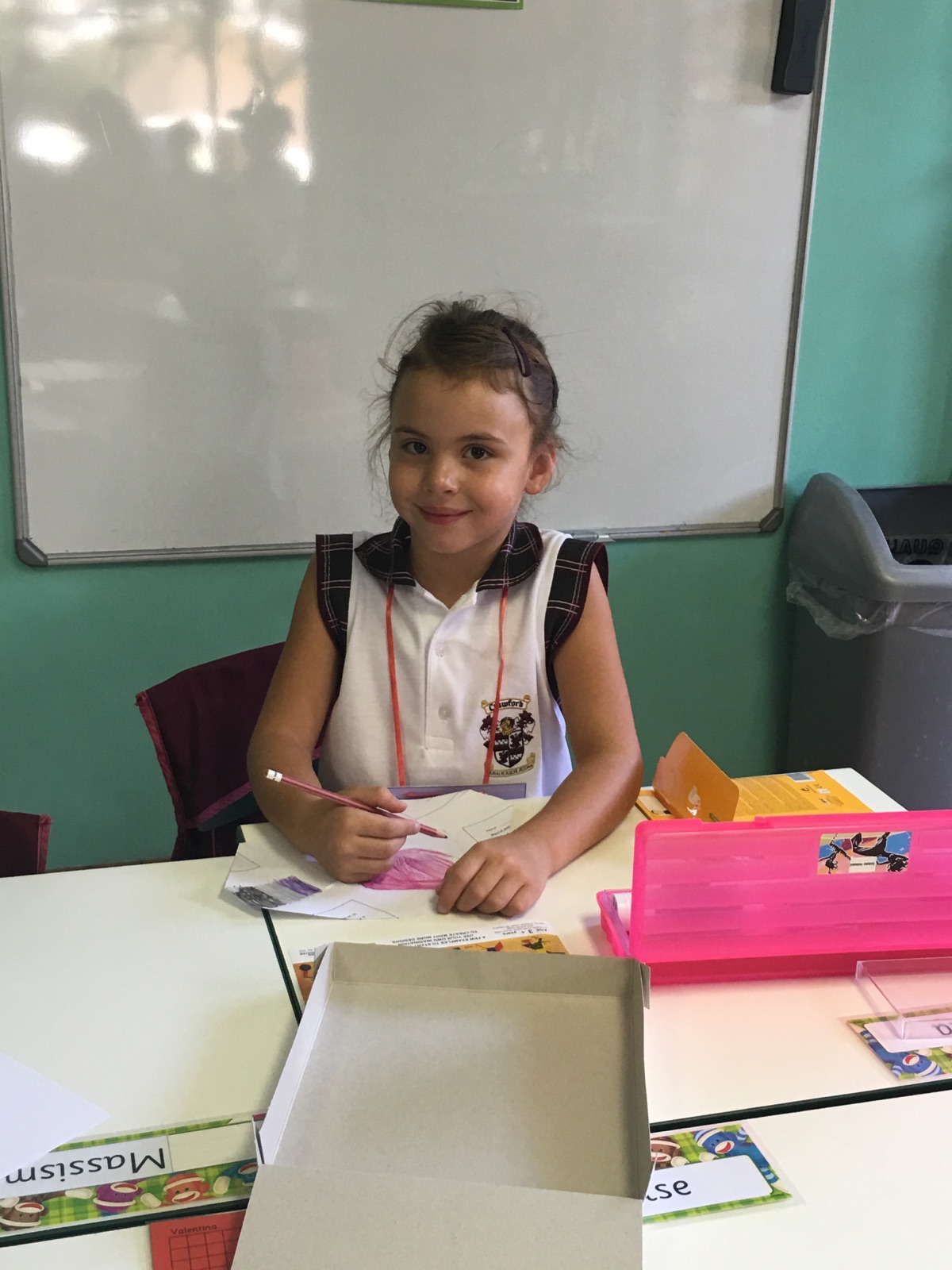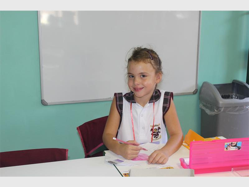 BIG SMILE: Pupil, Gemma Helmand, colours in on her first day of school.