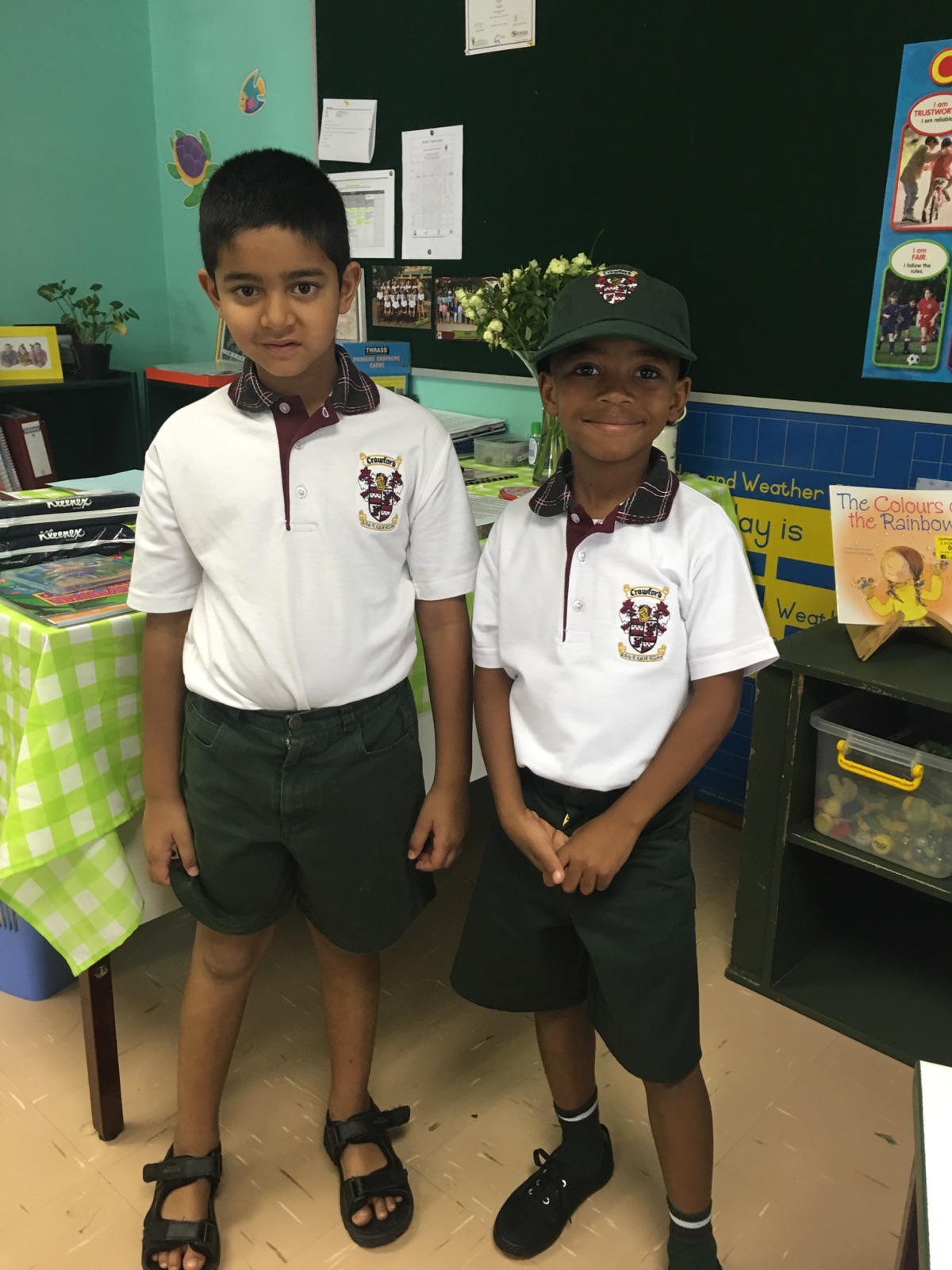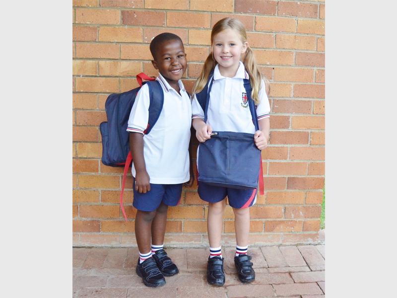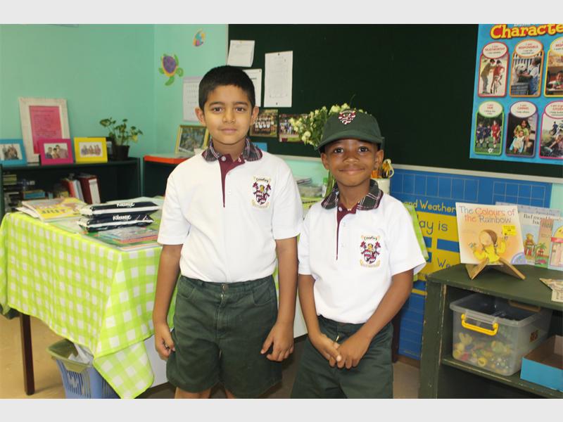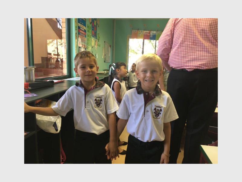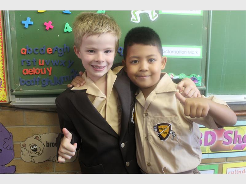 NEW FRIENDS: Pupils, Shivam Patel and Vuyolwethu Gxumisa on their first day of school.
