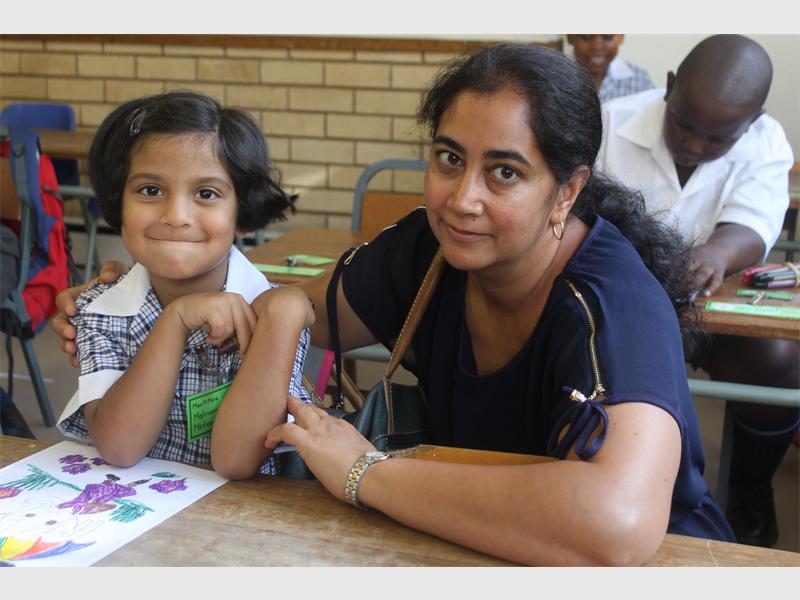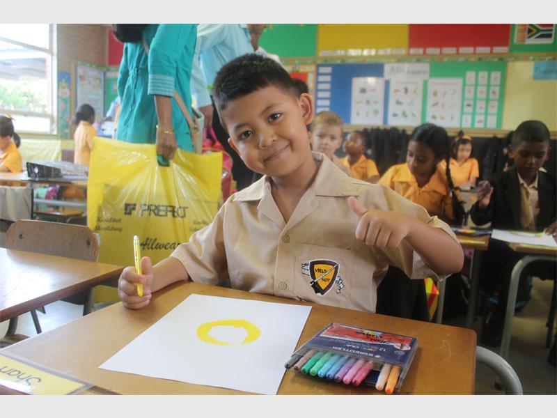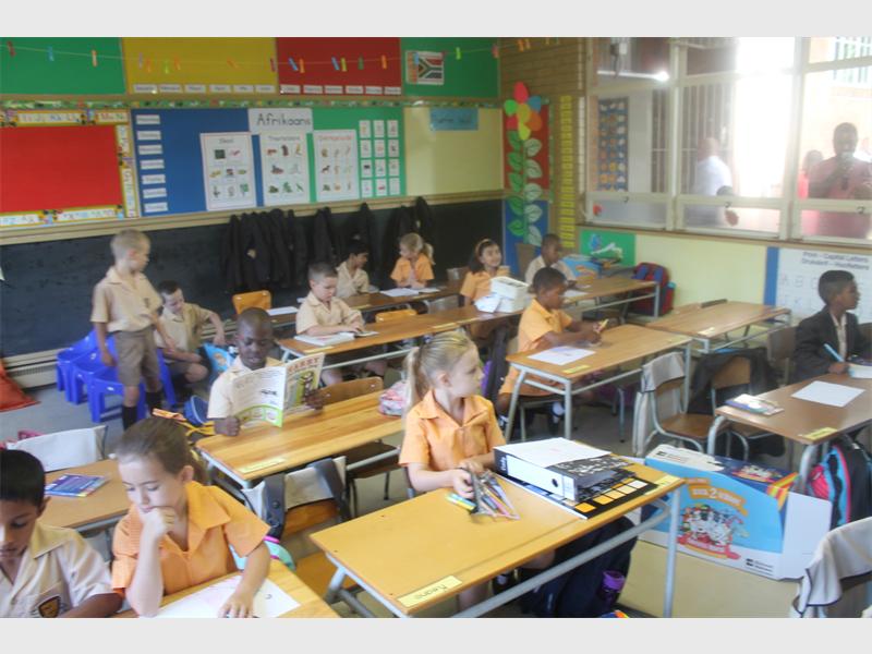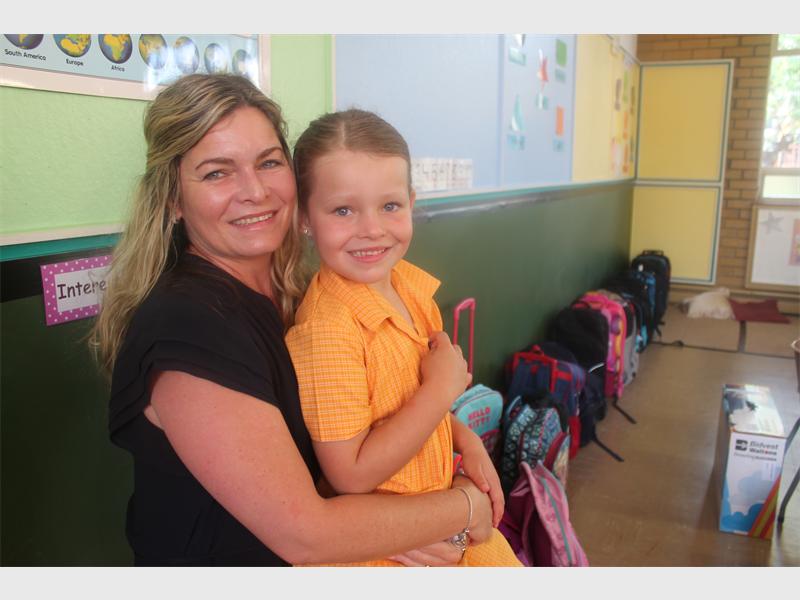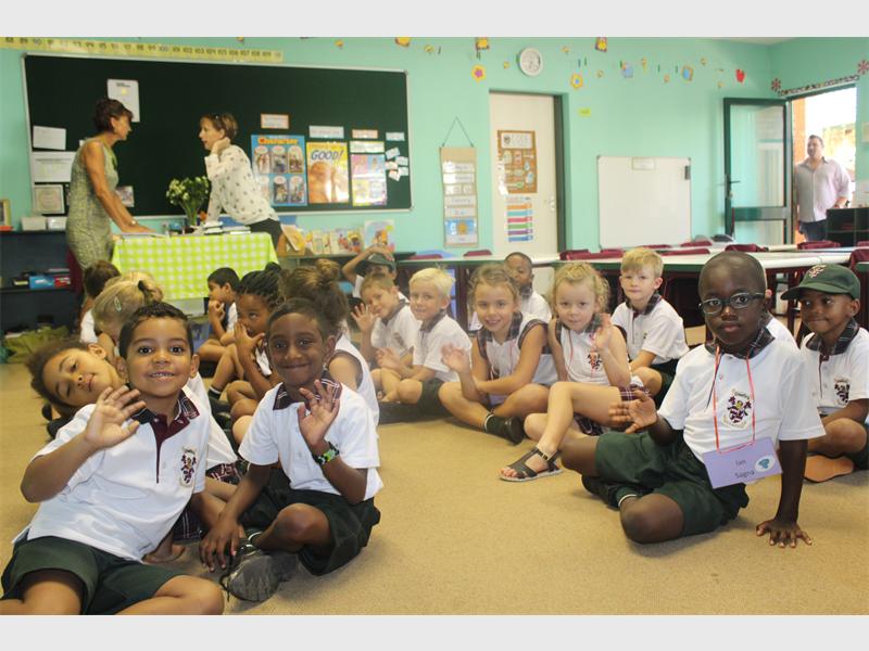 Excitement… Buccleuch Primary School Grade 1 D teacher Marile Mare welcomes her new Grade 1 pupils to her class.