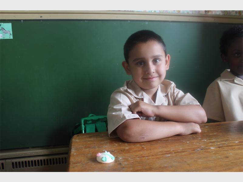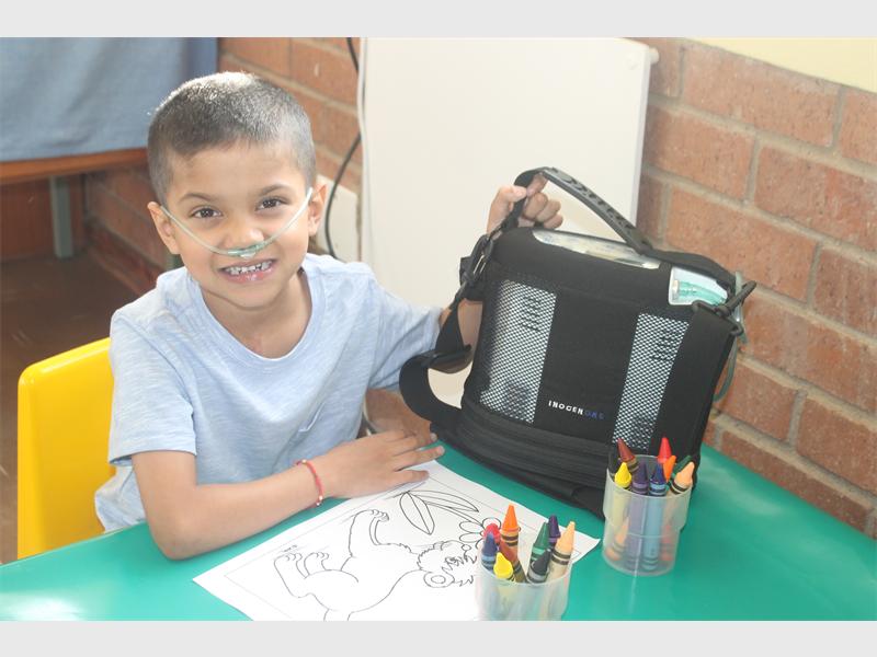 His heart beats on… Ayaan Bhoopal (5) joins other Buccleuch Primary School Grade R pupils on 13 January. He is seen here with his portable oxygen machine.
