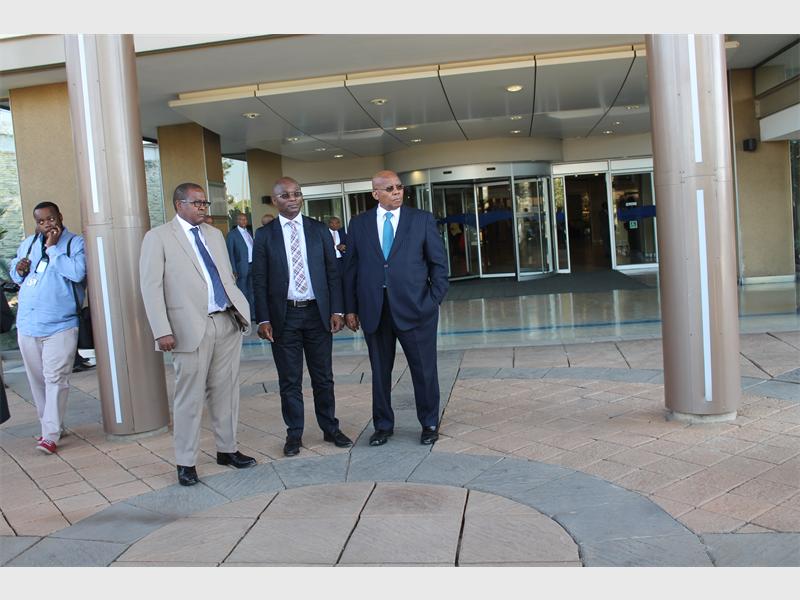 Eskom CEO Brian Molefe with Deputy Minister of Public Enterprise Bulelani Magwanishe and Chairperson of the Eskom Board Ben Ngubane as they wait for President Jacob Zuma to arrive.