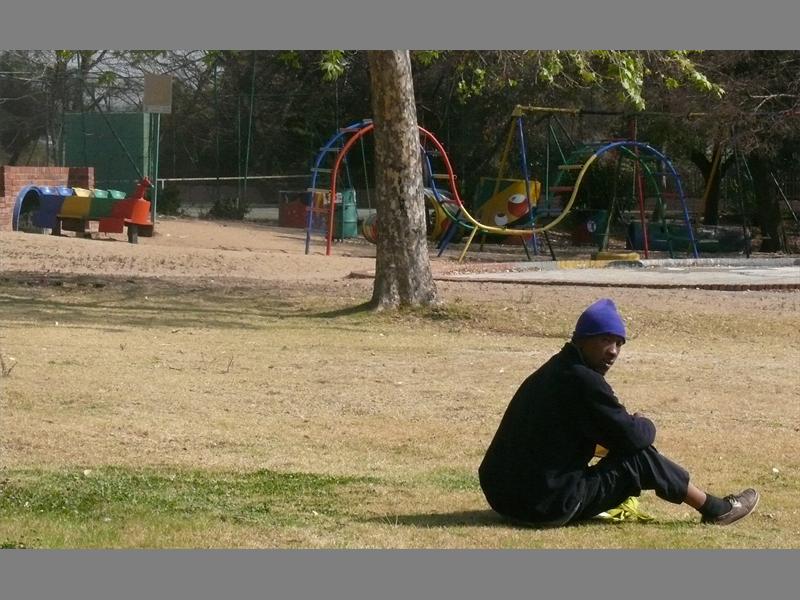 Taking over the park... A vagrant is using the facilities in the park as if it were his own home.