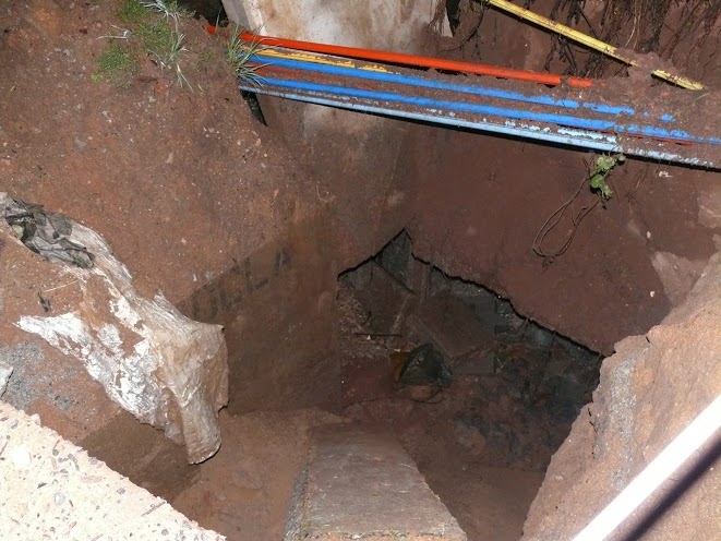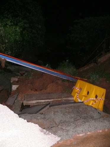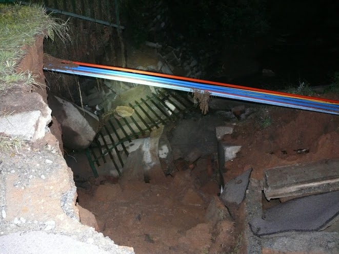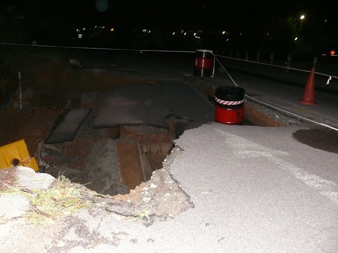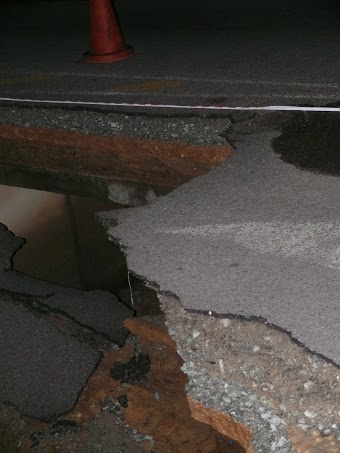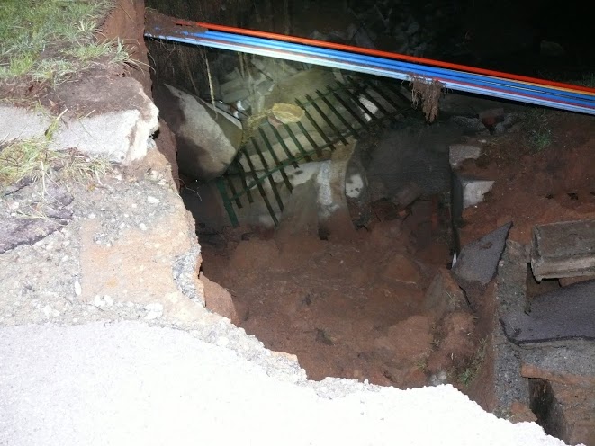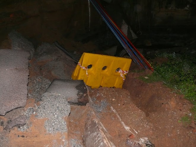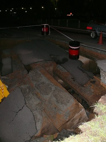 The barricade that used to line the road can now be seen at the bottom of a 10m deep pit. The fence and park that was also next to the road has also disappeared when the surfaced collapsed. According to those on the scene the pit is about 10m across and 10m deep. Cable sleeves can also be seen in the pit, but these appear to still be in tact. The river can be seen to be flowing freely between stacks of tar and concrete.