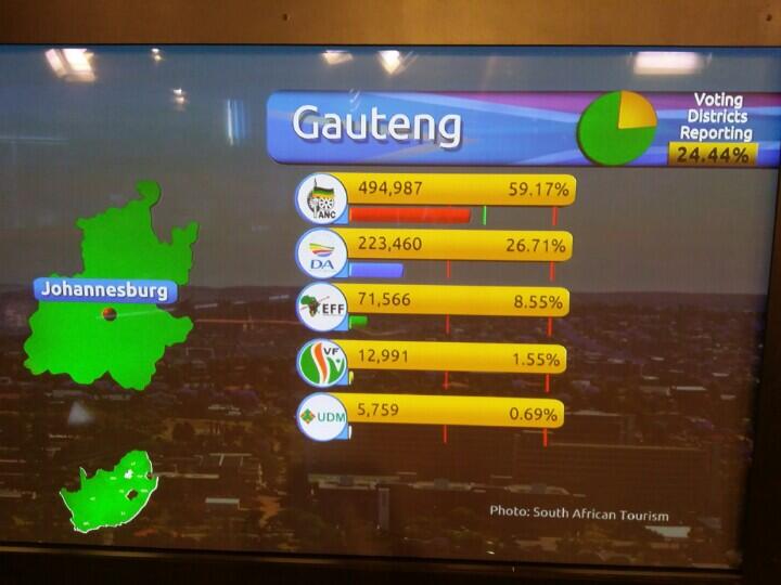 According to election predictions by the SABC, the DA would get approximately 22 percent of the national vote, up from 16.6 percent in 2009, and the Economic Freedom Fighters (EFF) were predicted to receive just under 5 percent of the national vote.