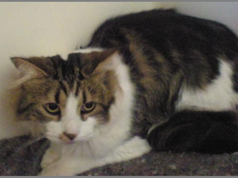 Patti is a three-year-old female white tabby cat female. This stray cat is shy.