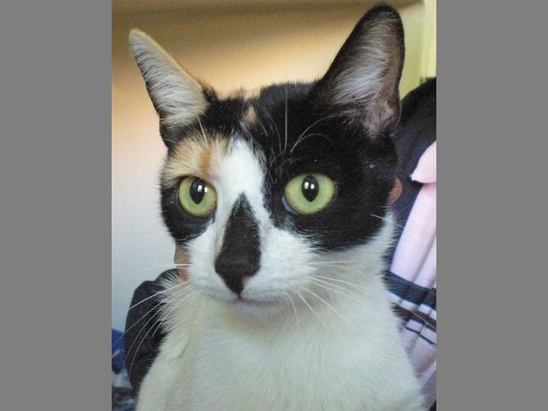 Splotch is an 18-month-old female domestic short-haired calico cat. She was unwanted by her previous owner and is affectionate.