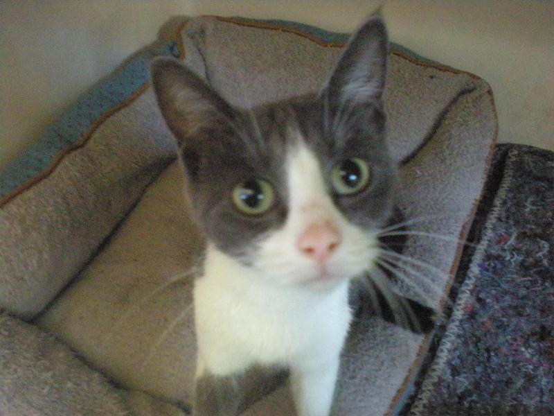 Rafiki is a one-year-old female grey and white domestic short-haired cat. She was unwanted by her previous owners and is lovable.