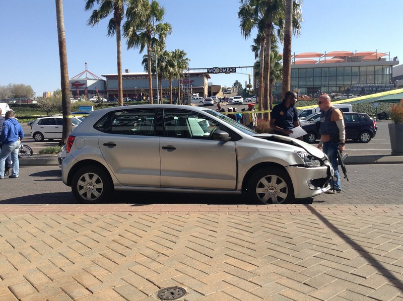 According to a security guard at the centre the suspects had allegedly stolen the car from a Volkswagen dealership in Midrand. Norman Makgalemele, building manager of the Woodmead Retail Mart, said that the suspects drove into the shopping centre in a Volkswagen Golf with a police helicopter pursuing them. A shooter in the helicopter shot at the car three times until their vehicle stopped and the two suspects ran into the centre.
