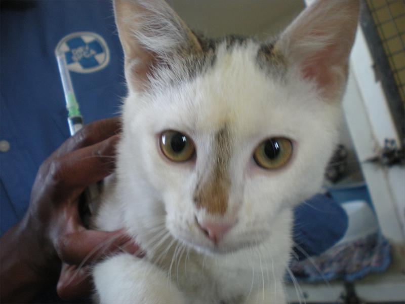 Splotch is a white domestic short hair cat. He is four months old and was a stray. He is very cute and is looking for a loving family.
