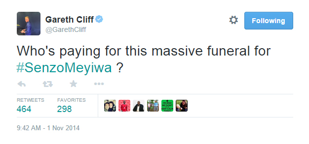 Gareth Cliff causes havoc with #SenzoMeyiwa tweet