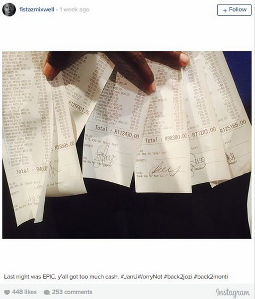 The image, which shows a number of bills of large amounts, some as high as almost R129 000, surfaced on 18 January and were attributed to a “crazy night out” in Cape Town on 11 January.