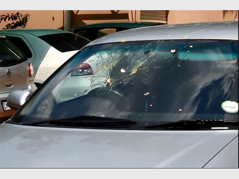 Sandton Chronicle journalists experimented the affect of half a dozen eggs thrown at a car’s windscreen.