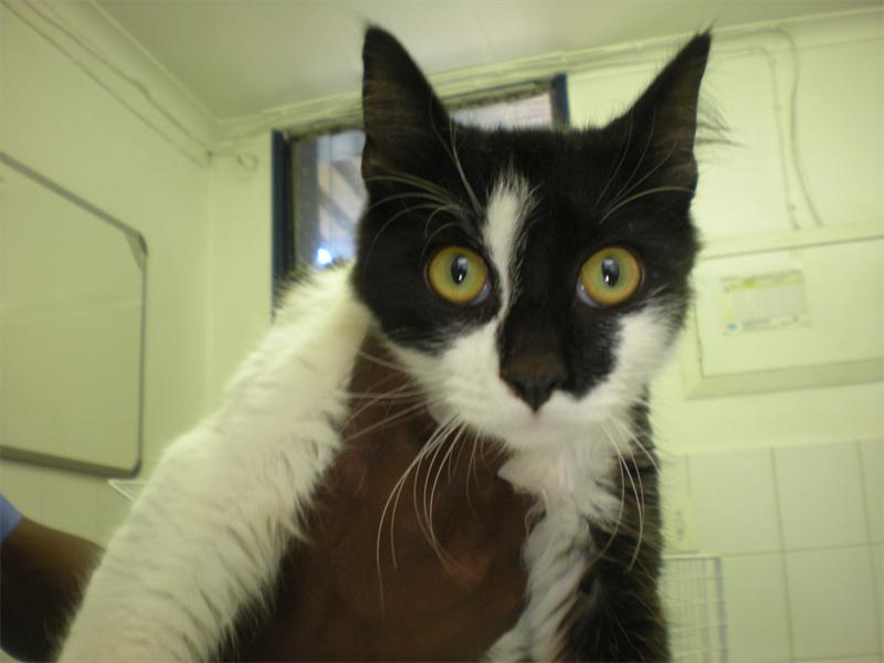 - Chuck is a black and white domestic medium-haired male cat who is seven months old and was found as a stray. He loves to cuddle.