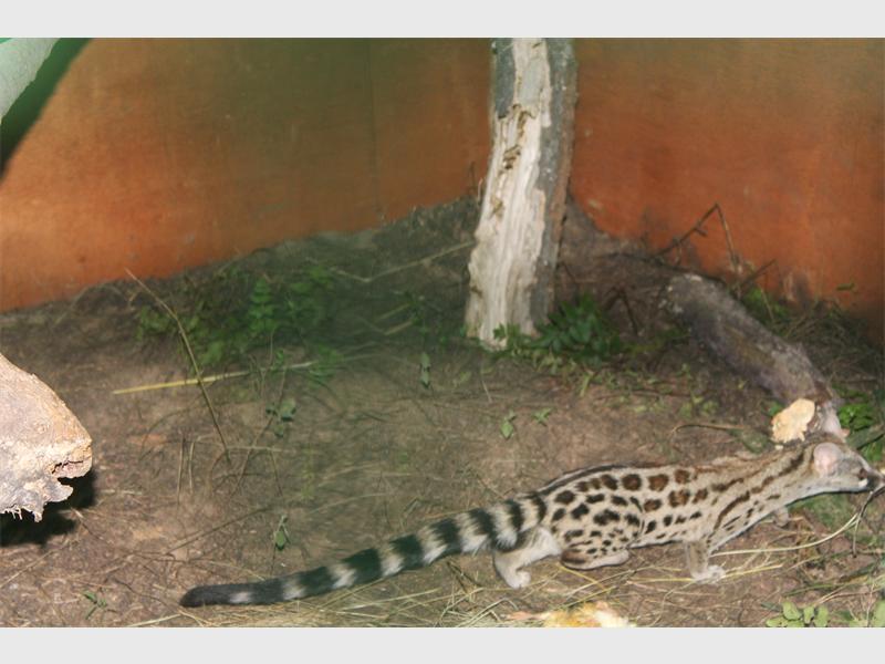 Wright explained that while many people have never seen a genet, they are actually extremely prevalent in Johannesburg. However, they are nocturnal animals which mainly live in trees. There are two types of genets, the small-spotted genet and the large-spotted genet, the differences between the two types are the size of the rosettes on their coats and the colour on the tip of their tails. A large-spotted genet will have a black tipped tail, while a small-spotted genet will have a white tipped tail. A fully grown large-spotted genet will weigh between five to seven kilograms.