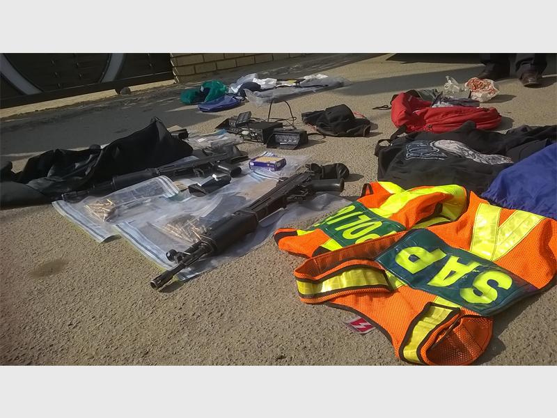 The police also recovered five unlicensed firearms, including three 9mm pistols and two R5 rifles, two blue lights, two reflector jackets, handcuffs, cable ties, ammunition for the different calibre firearms and a siren from the vehicle.