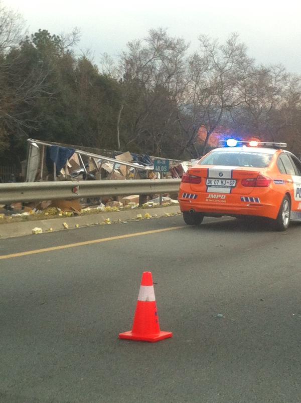 A truck is believed to have overturned on the N1 just before Rivonia road.