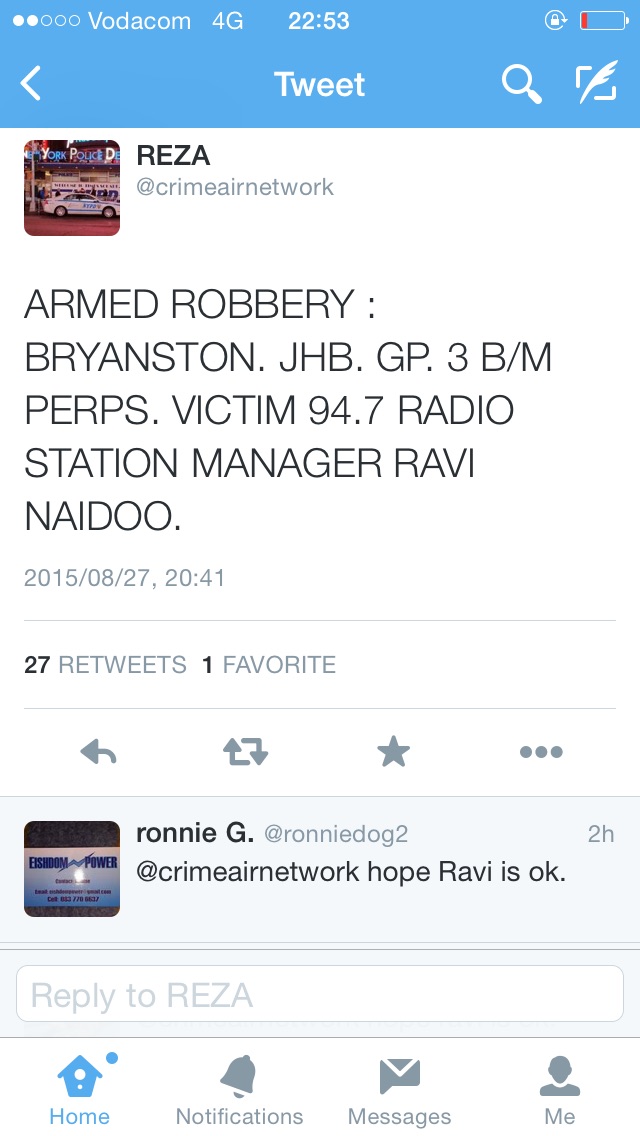 Public relations manager for 947 Radio Pippa Rowles said that Naidoo was at a family friend’s home to pick up his daughter when three armed suspects approached him in the driveway.