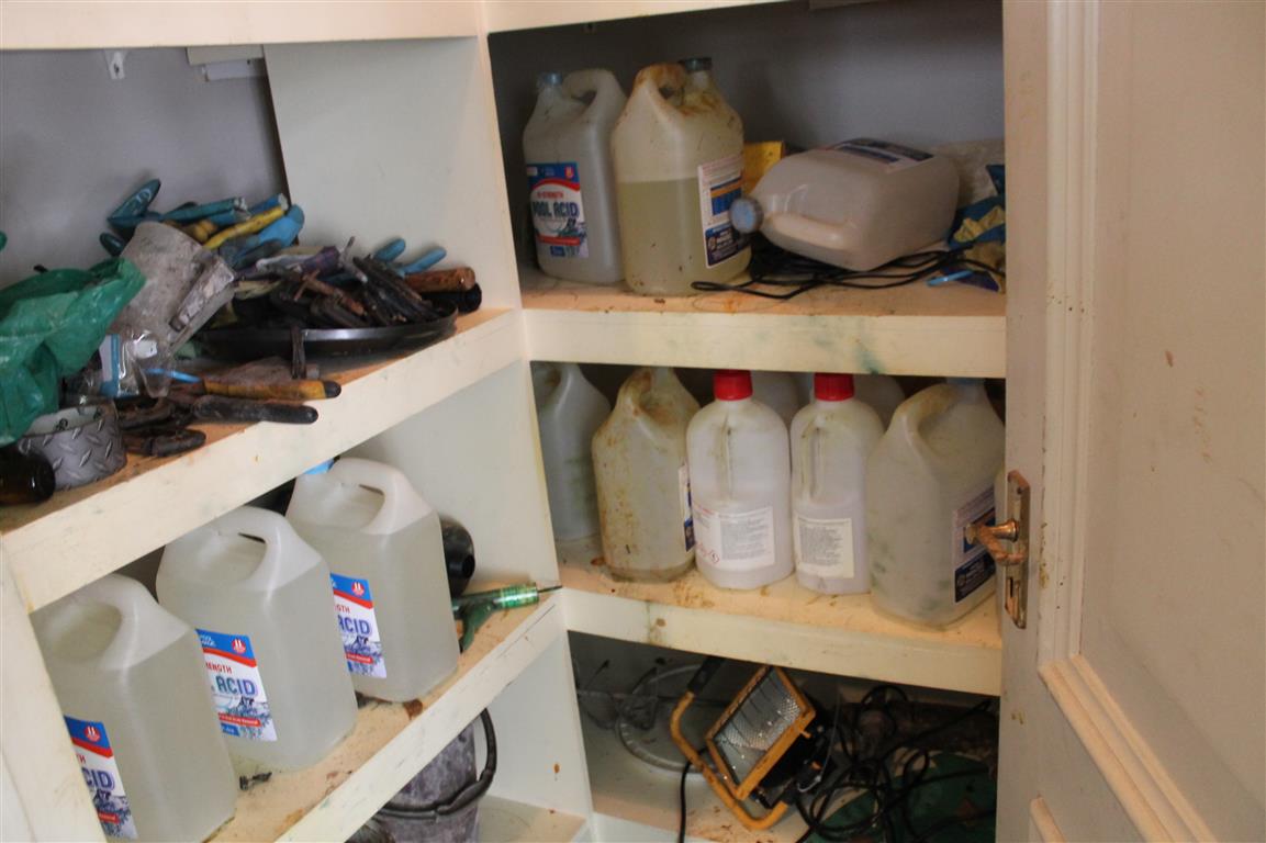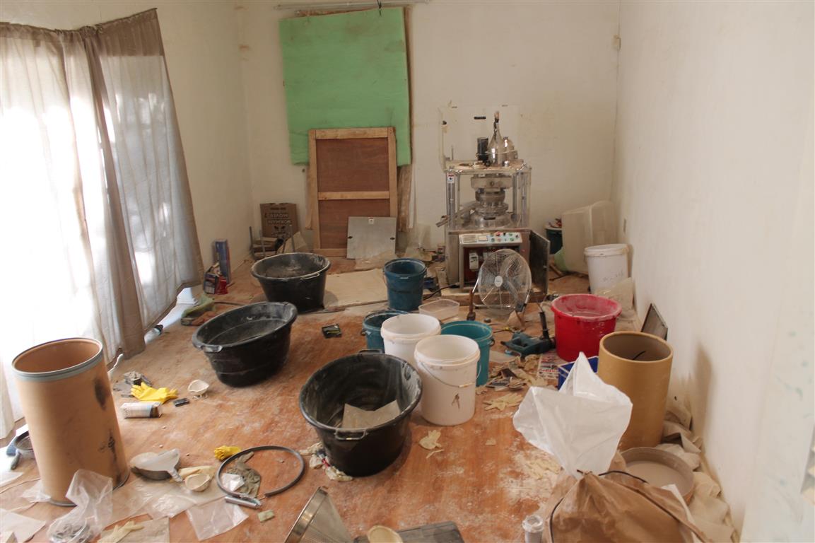 In the cottage, there was a soundproofed room where a grinder and press were found which, it is believed, were used to compress the methaqualone powder into pills. Gas masks were also recovered.