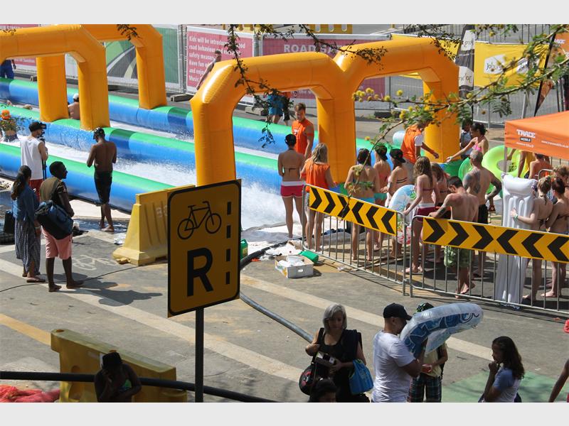 SANDTON – Part of West Street in Sandton was covered with a 300m-long slippery slide for all to enjoy.