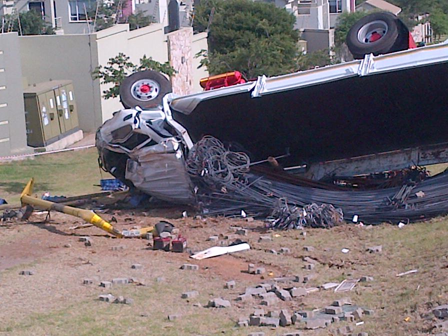 An eyewitness at the scene claimed the truck was driving on Dover Road and drove through the intersection with William Nicol Drive while the traffic light was red. The truck collided with a vehicle that was driving along William Nicol Drive, crashed into a traffic light and rolled down the embankment.