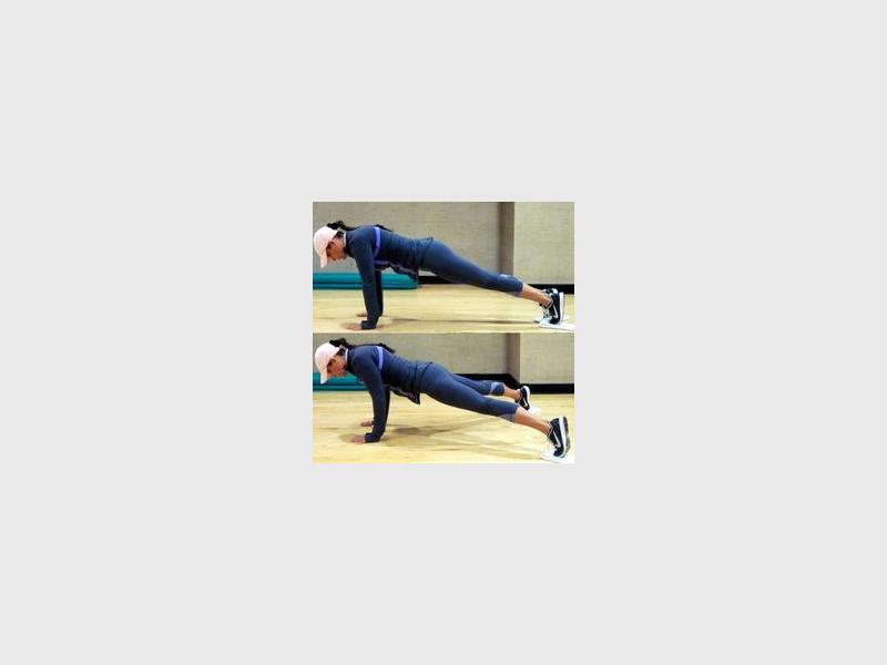 • Lift your right hand and left leg off the ground and hold. Then switch, alternating hands and legs.