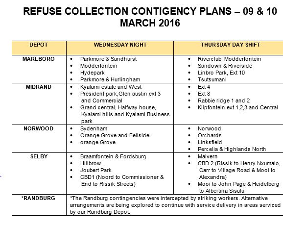 Regarding the refuse collection schedule, residents and business owners can call the Pikitup regional manager responsible for their area on the following numbers: