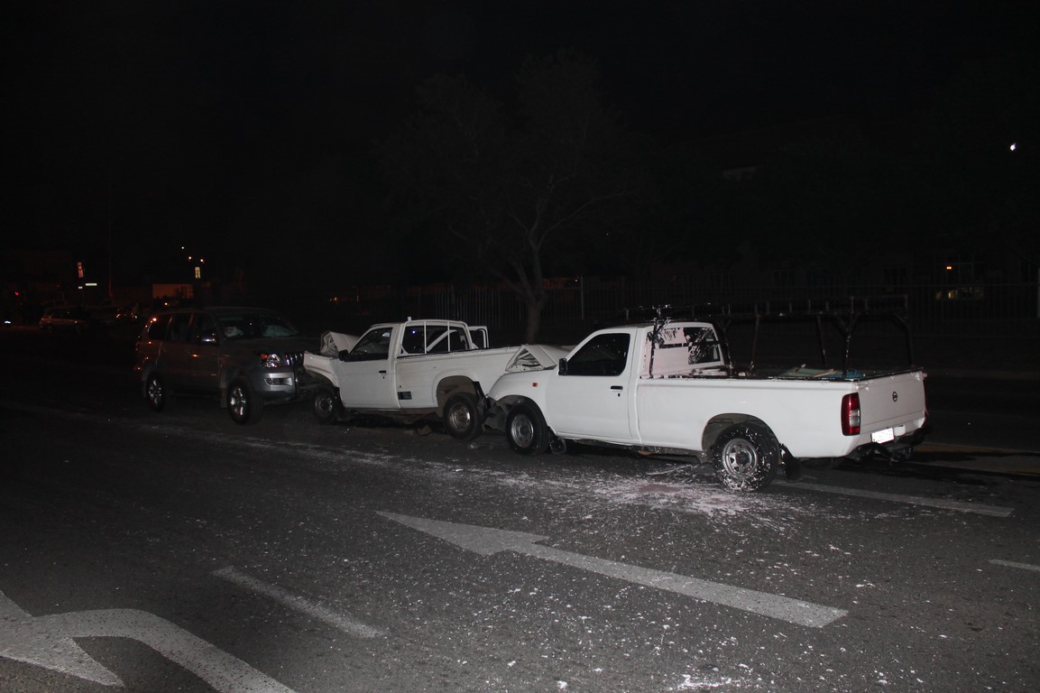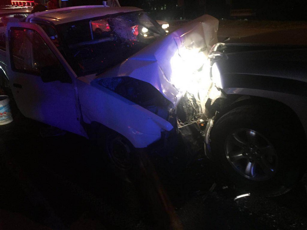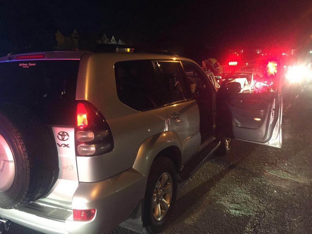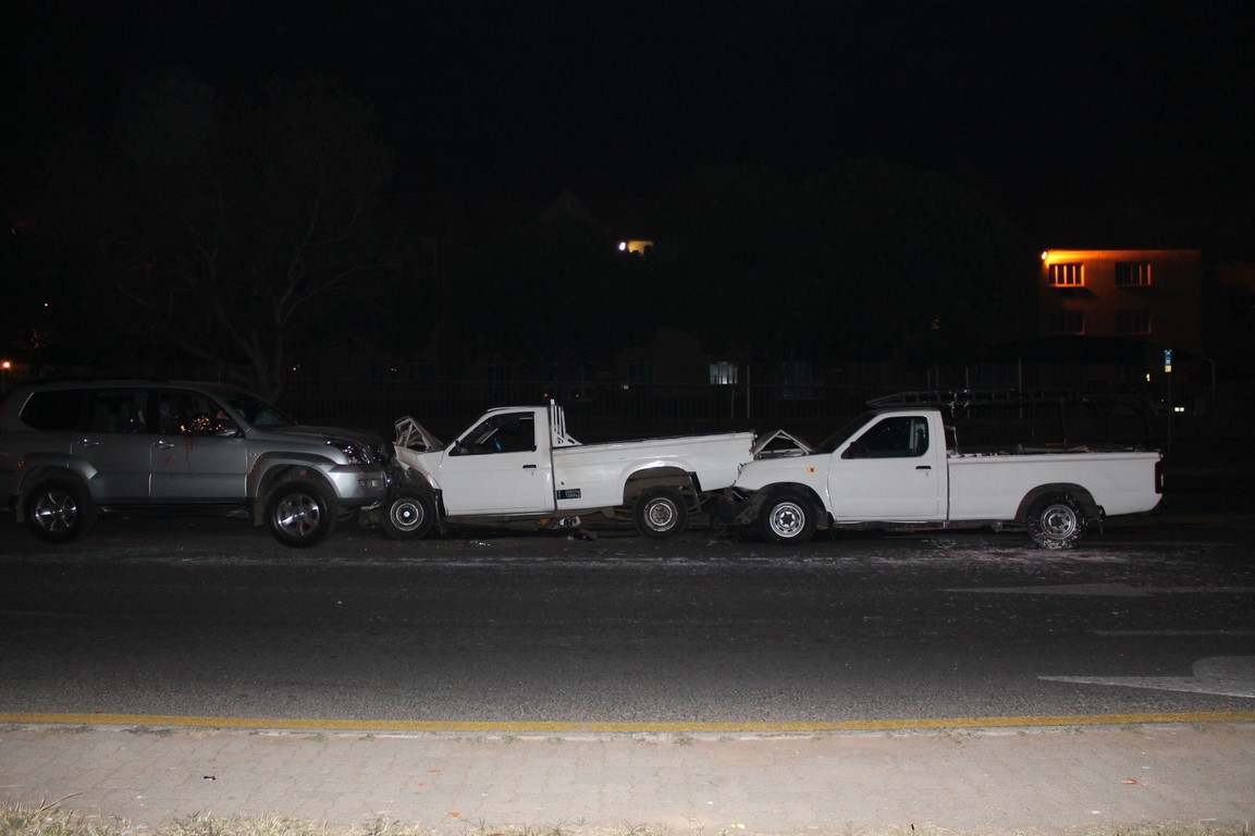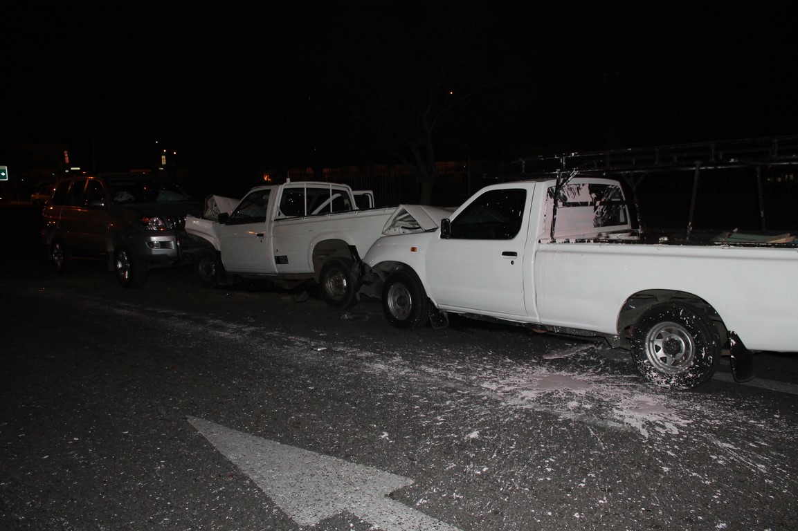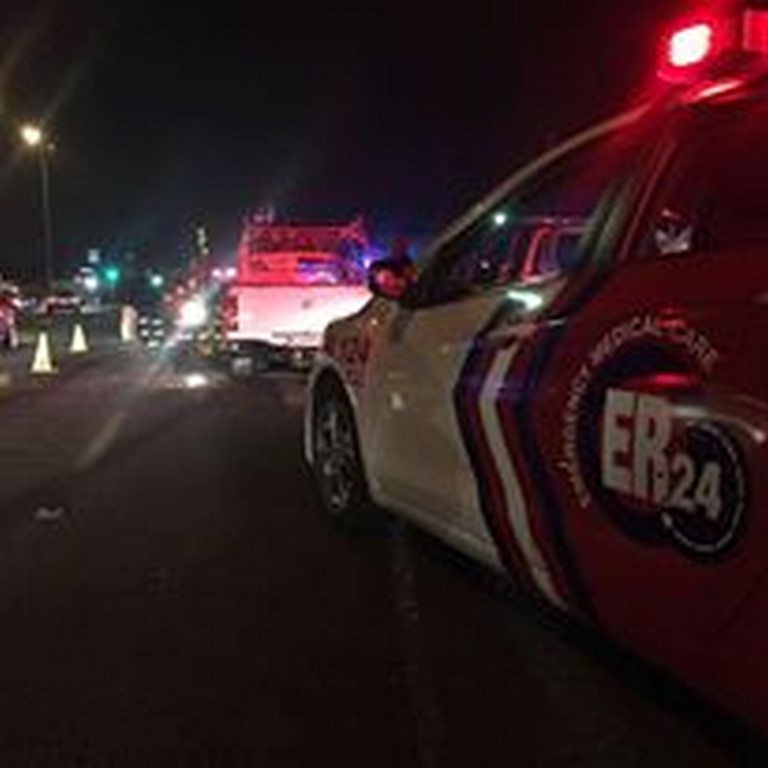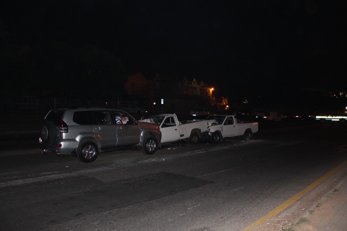 UPDATE: 1 June 2016, 8pm – According to ER24, A man was driving a Toyota Prada. He suffered multiple gun shot wounds. The vehicle then went off the road and hit oncoming traffic that collided with the bakkie.