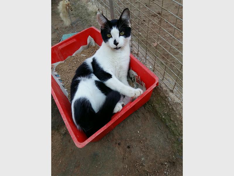 • Speckle is a black and white domestic short-haired cat. He is a 10-month-old who was received unwanted and is described as very friendly.