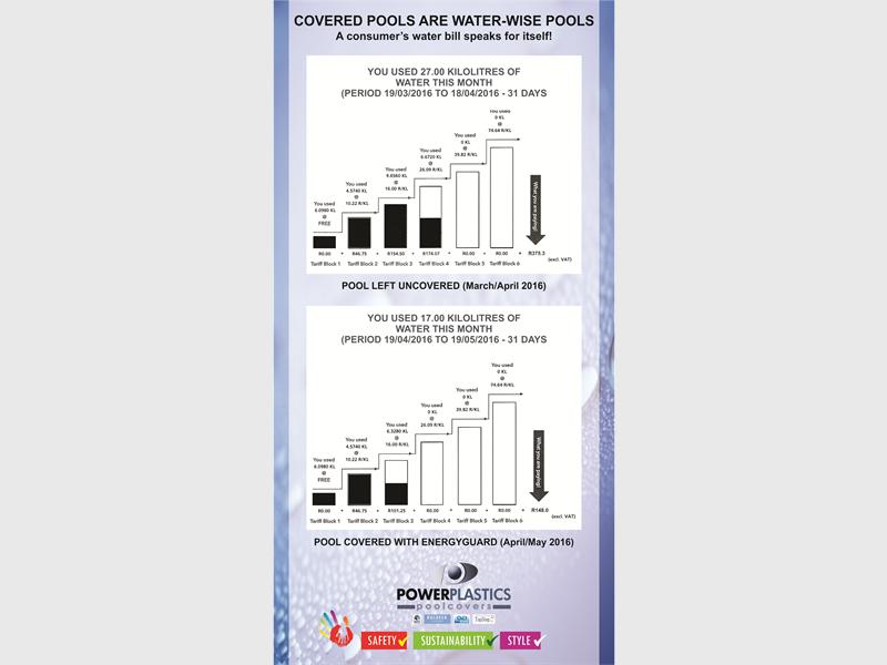 “One of our customers recently shared her water bills with us. During the summer, her pool was used daily, therefore, she opted to leave her pool uncovered, but was topping up every few days in order to keep her pump running. When the weather started to cool down in April/May, she recovered her pool and the figures speak for themselves. Her home’s water consumption went from 27.00 kilolitres in March/April to 17.00 kilolitres in April/May. She went from Tariff 4 prices down to Tariff 3 prices and saved 37 percent on her water bill. No other habits changed in her home so the savings can be directly attributed to the use of her pool cover.