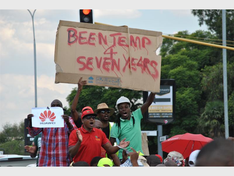 Workers contracted to Huawei protest on Grayston Drive due to possible retrenchments.