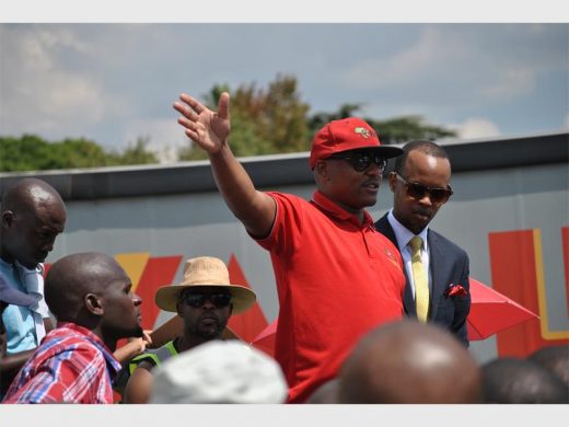 A member of the EFF speaks to the gathered protesters on Grayston Drive.