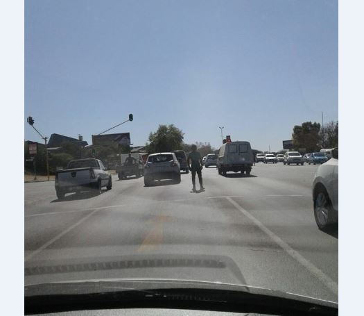 The man reportedly stands at the robots on the corner of William Nicol Drive and Republic Road and refuses to move out of the roadway, hitting and spitting on cars.