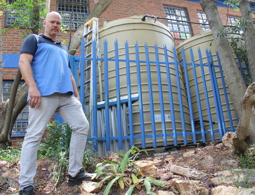 Estate manager at Bryanston Primary School, Grant Hard stands in front of the two water tanks supplying Bryanston Primary schoolchildren with water for sanitary purposes. One of the water tanks is already empty while the other is very low.