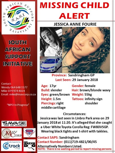 Jessica Anne Fourie (17) went missing on 29 January and was last seen in Linbro Park.