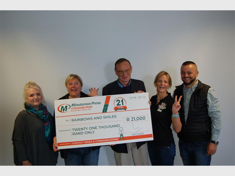 Minuteman Press in Strijdom Park recently donated R21 000 to charity Rainbows and Smiles to celebrate its 21st anniversary.