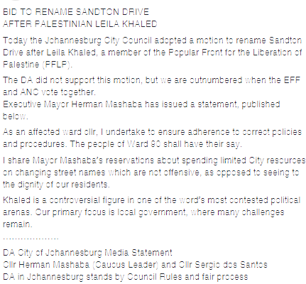 The statement read that a motion was tabled in Council to move that the City rename Sandton Drive to ‘City of Ramallah’ Drive.