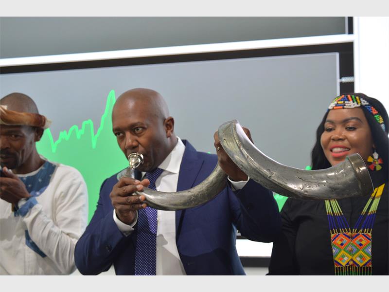 Tourism South Africa CEO Sisa Ntshona blows the horn to signify the opening of the market at the Johannesburg Stock Exchange.